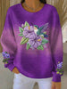 Women's Purple gradient hummingbird floral print Ribbed Round-Neck Sweatshirt